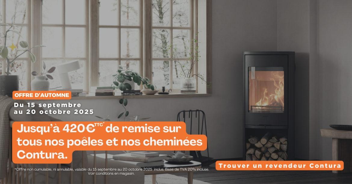Jusqu’à 420 € TTC de remise sur tous nos poêles et cheminées Contura : du 15 septembre au 20 octobre 2025.